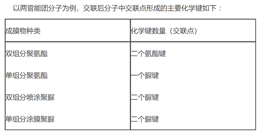 雙組分聚氨酯交聯后,交聯點形成氨酯鍵;單組分聚氨酯、單組分聚脲、雙組分聚脲固化交聯后交聯點均形成了脲鍵。但單組分聚氨酯只有一個脲鍵。雙組分聚氨酯反應過程中極少量的水份也會與NCO反應,產生極少量脲鍵。
