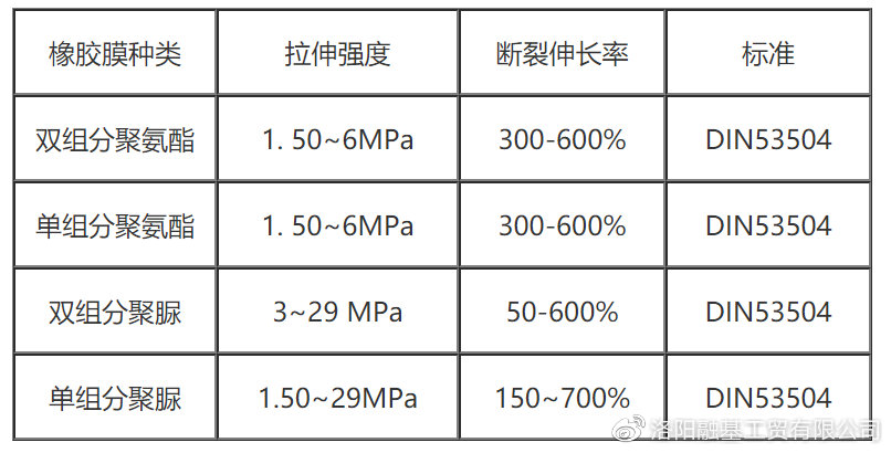 上述表中,單組分聚氨酯在交聯固化過程中,在水份作用下二個NCO產生一個二氧化碳分子,生成一個脲鍵。而單組分聚脲在交膠固化過程中,在水份作用下,解除封閉的胺基,而形成二個脲鍵。正是由于單組分聚脲和雙組分噴涂聚脲在交聯后交聯點上形成二個脲鍵,其本體強度大大高于聚氨酯。而單組分聚氨酯交聯后形成了一個脲鍵,其強度低于具有兩個脲鍵的聚脲,另外其產生二氧化碳氣泡也是造成強度低的一個原因。雙組分聚氨酯固化后形成了2個氨酯鍵。上述為一種理想狀態,實際交聯反應要復雜得多。聚脲中有擴鏈劑,聚氨酯中也可有擴鏈劑,擴鏈劑均參與反應。另外在高溫潮濕環境下,還有水份參與競聚反應。反應過程中所選用分子種類、分子鏈大小以及擴鏈劑甚至包括施工過程等,對固化后的橡膠膜均有影響。